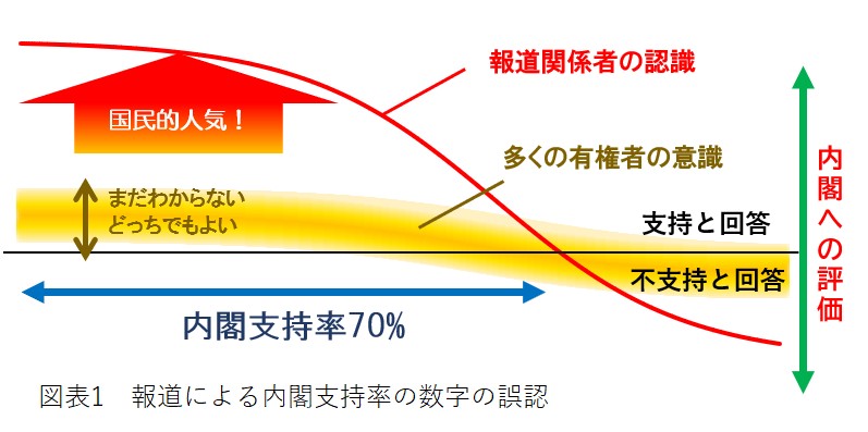 SNSを覗くと、似たようなことを言っている報道関係者、評論家みたいな方々もいたりします。このように、内閣支持率と名付けられた一つの数字を見て、首相が人気だとか不人気だとか騒ぎ立てるのを見ると、政界周辺の世論調査に関する知識や理解は全然向上しないなという感想を持ちます[1]。