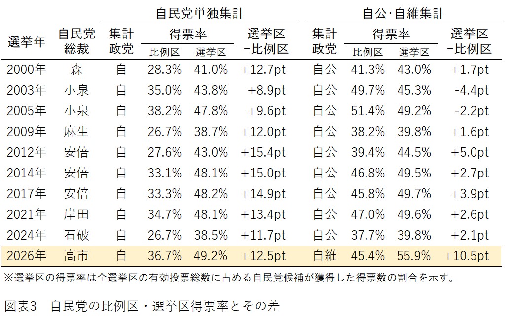 実際のデータを確認してみよう。図表3は、自公連立以降の衆院選について、自民党および同党と協力関係にあった公明党(2024年まで)、維新の会(2026年)との合計の比例区、選挙区の得票率、およびその差を示している。2024年まで、自民党単独で計算すれば選挙区得票率は比例区得票率を常に大きく上回っていたが、これは公明党との協力があったためである。自公で得票率を合計すれば、選挙区と比例区の得票率差は小さくなる。
