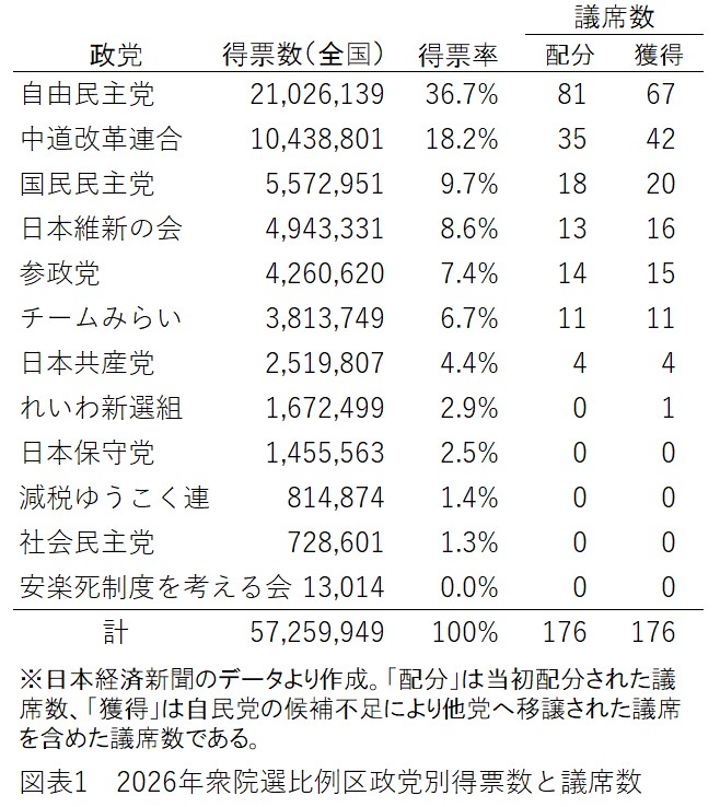 このように、2026年衆院選の最大の特徴は、自民党選挙区候補が公明票の離反にもかかわらず自民党の基礎的な支持を示す比例区得票率を大幅に超える票を集めた点にある。自民党は比例区ではなく選挙区で独占的に議席を集めたことから、この点をいかに説明し、分析するかが、今回の選挙の理解の鍵となるはずである。