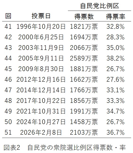 このように書くと、今回の自民党の得票率が低いように感じるかもしれない。しかし、今回の自民党得票率は、図表2に示すように並立制下では2005年の郵政解散に次ぐ高い値である。つまり高市自民党は、歴代自民党政権の中でも高水準で支持を集めていたと言える。